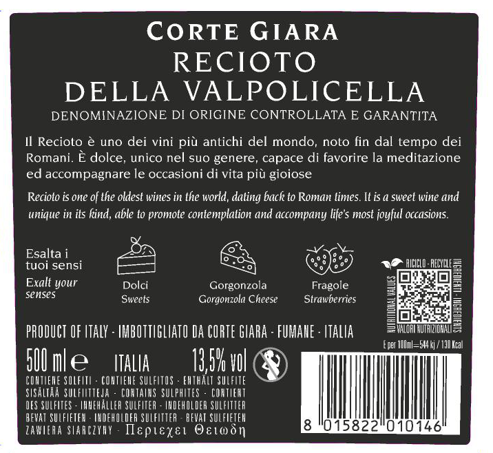 Recioto della Valpolicella Classico DOCG trova il suo perfetto abbinamento con dolci secchi o a base cacao, ma è da provare anche con formaggi molto stagionati o erborinati o secondi piatti con salse a base di frutta o frutti rossi.