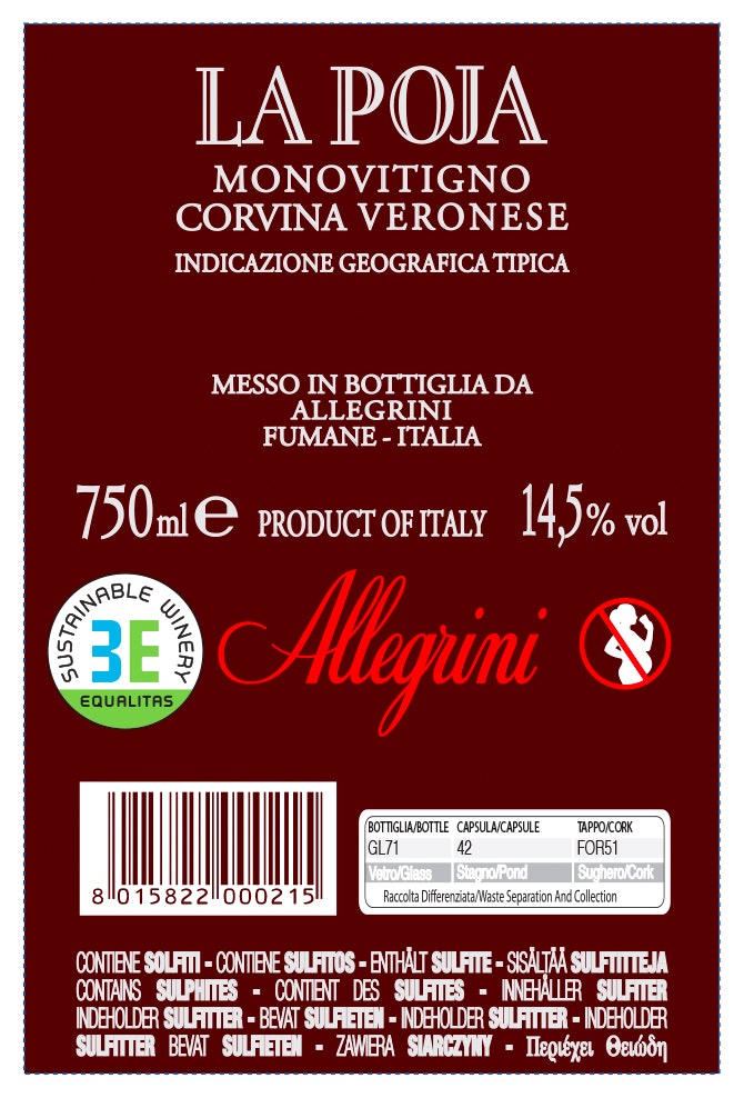 Corvina 100%, harvested at its perfect ripeness, it evokes aromas of both red and black fruits such as black cherry and brambles along with floral notes of dried rose that lend great elegance on the nose. The character is warm, ripe, with vanilla and forest floor notes that could be enhanced with bottle ageing. The sip is fresh, velvety, with ripe tannins very well integrated into the wine. The body is full and fulfilling with long fruity and balsamic sensations in the aftertaste.