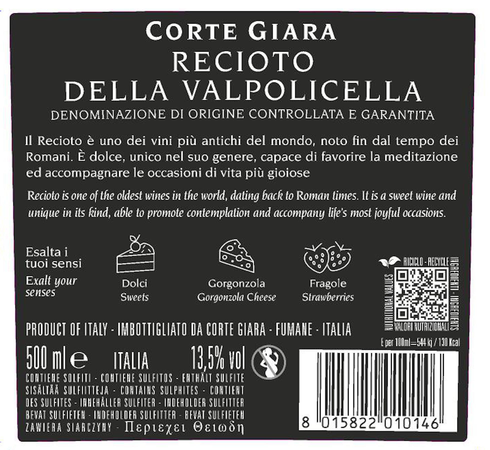 Recioto della Valpolicella Classico DOCG pairs perfectly with dry desserts or those made with cocoa, but it is also worth trying with well-aged or blue cheeses, or main courses with fruit or red fruit-based sauces.