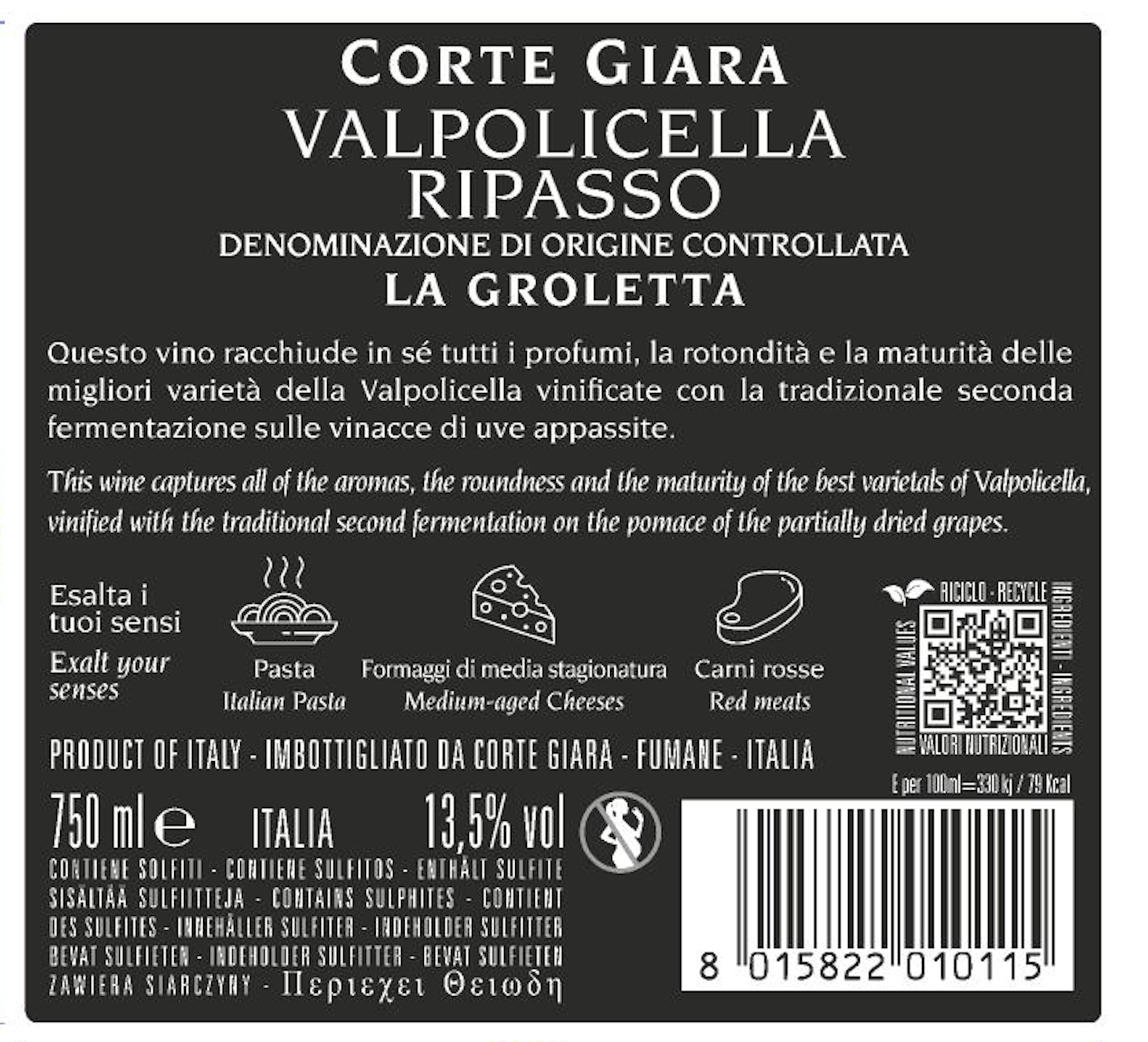 The traditional Ripasso technique gives this wine a great fruity expressiveness, highlighting a strong fruit component, with softness as its distinctive trait.