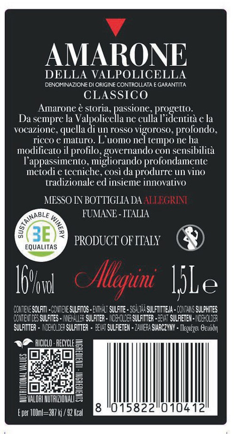 L'Amarone è storia, passione e progetto. Vigoroso e intenso, in grado di bilanciare sapientemente potenza ed eleganza, mantiene e valorizza l'integrità del frutto.
